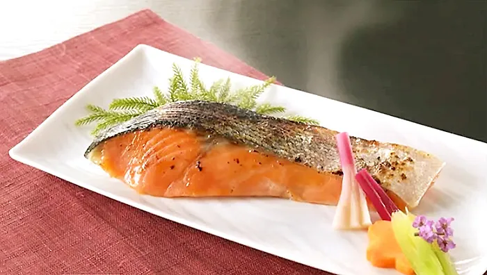 原材料銀鮭(チリ産)、味噌、砂糖、水飴、米発酵調味料、/アルコール、調味料(アミノ酸)、増粘剤(キサンタン)、着色料(ビタミンB2)(一部に大豆・鮭を含む)