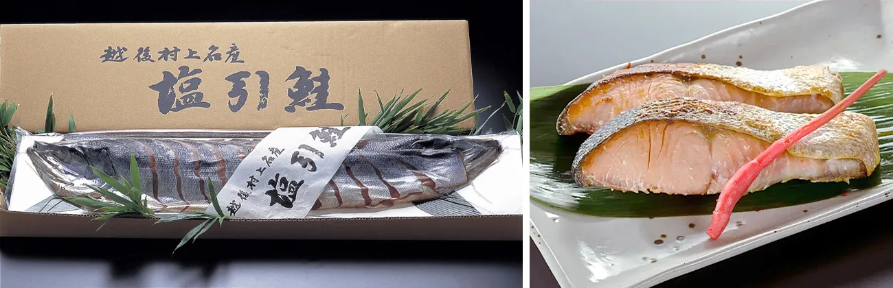 三面川でとれる脂ののった鮭を、伝統の技で仕上げた日本最高の塩引き鮭です。