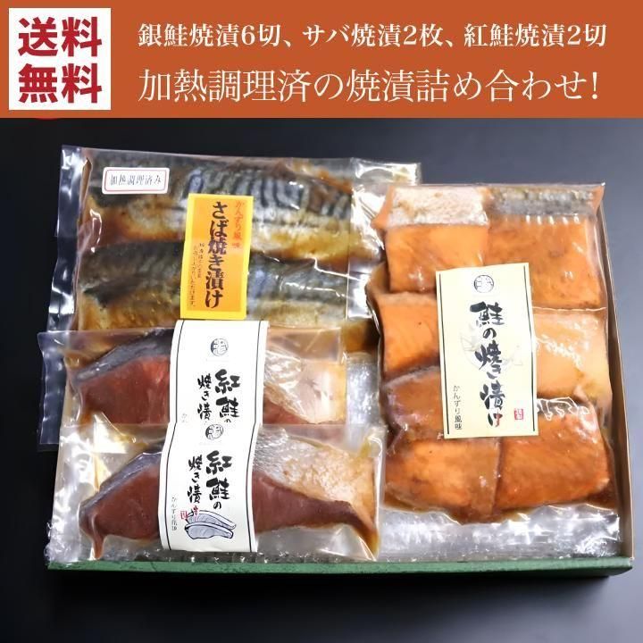 内容量銀鮭焼漬6切、サバ焼漬2枚、紅鮭焼漬2切